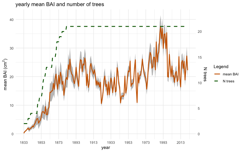 The object inData can be initially used to plot the mean chronologies of raw tree-ring widths (mm) and raw basal area increments (cm²), including their standard errors, alongside the corresponding number of trees, using the two following functions: