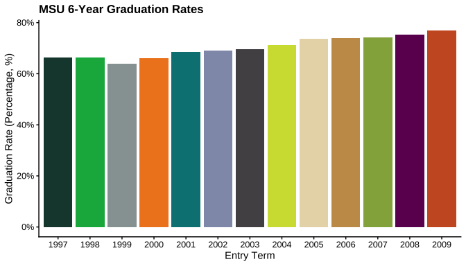 The authors of the RSSthemes package have created an excellent website discussing the ‘Best Practices for Data Visualisation’, published by the Royal Statistical Society. The RSS companion website is a great resource for anyone interested in data visualization and provides valuable insights into effective data communication. The MSUthemes package aims to bring these best practices to the MSU community, helping users create visually appealing and informative graphics that mirror MSU’s branding guidelines.