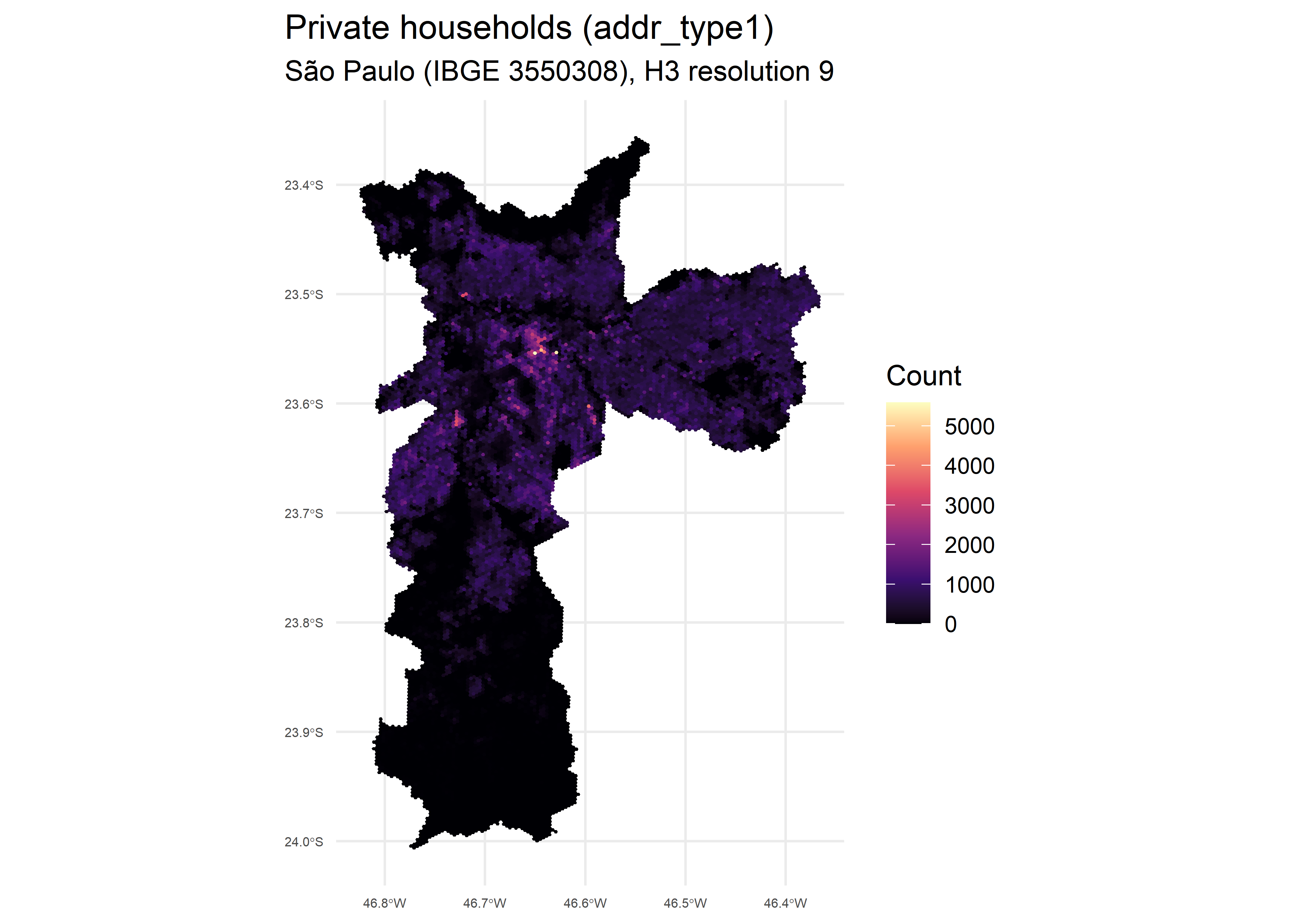cnefe_counts() aggregates CNEFE address points into spatial units and returns an sf object with counts by address category (addr_type1 to addr_type8). Below is an example using H3 hexagons for São Paulo at resolution 9: