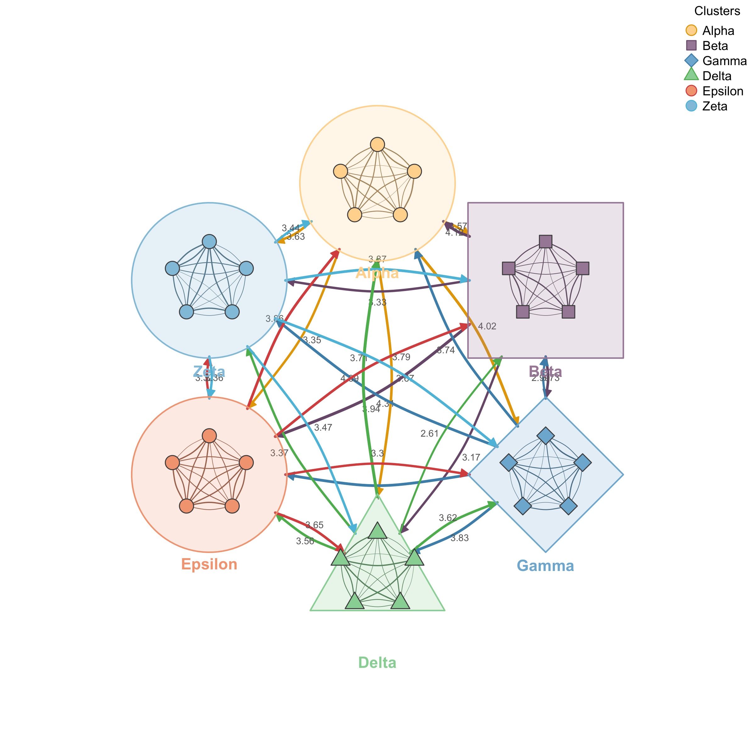 plot_mtna() visualizes multiple network clusters with summary edges between clusters and individual edges within clusters. Each cluster is displayed as a shape (circle, square, diamond, triangle) containing its nodes.