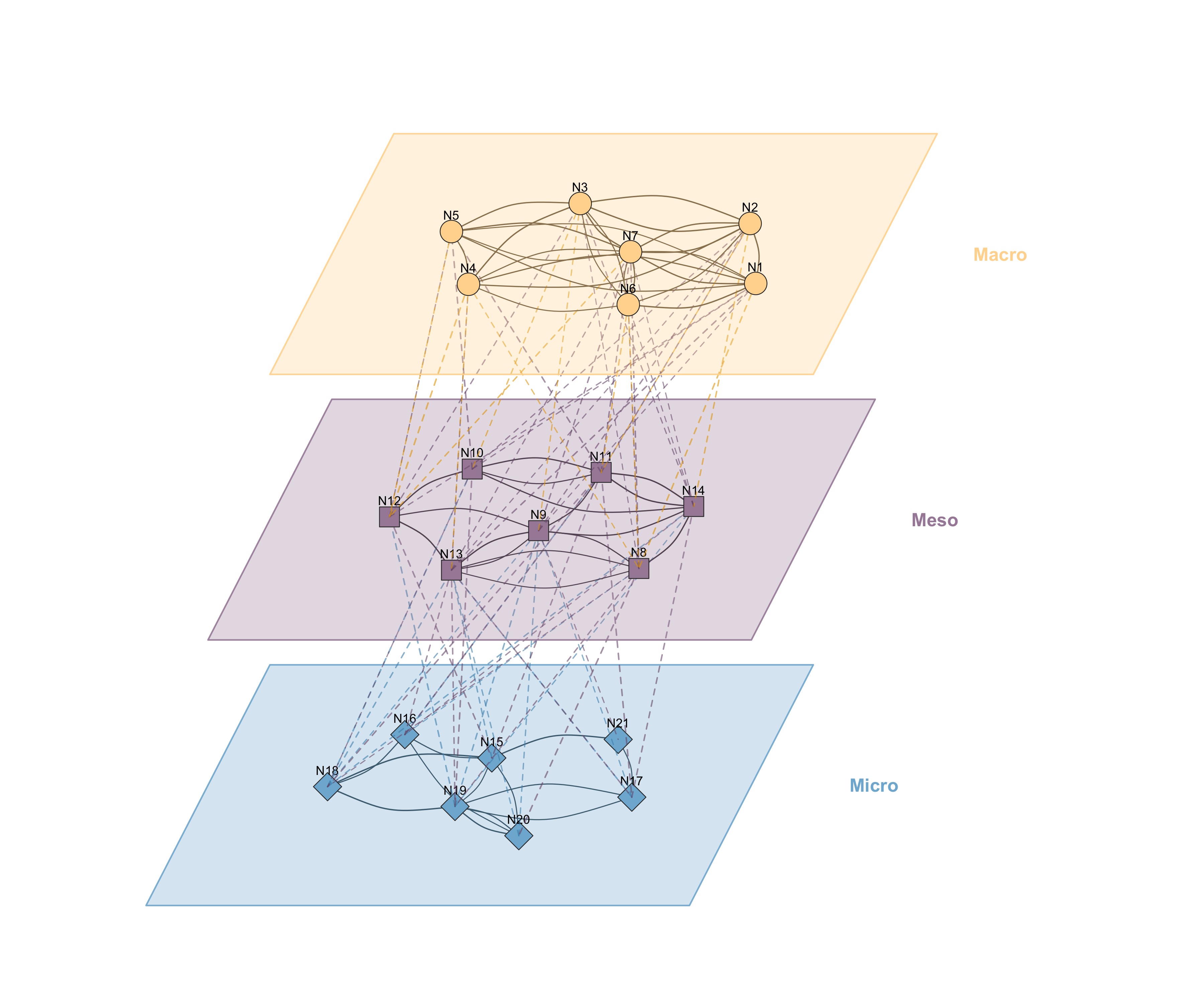 plot_mlna() visualizes multilevel/multiplex networks where multiple layers are stacked in a 3D perspective view. Each layer contains nodes connected by solid edges (within-layer), while dashed lines connect nodes between adjacent layers (inter-layer edges).