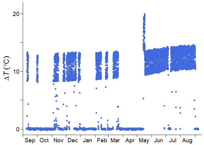 where \(\Delta T\) is the temperature difference between sap flow probes, which will be used in calculating the sap flux density (\(F_\mathrm{d}\)).