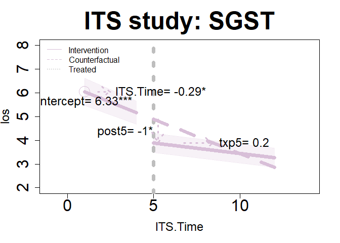 #> F-statistic: 27.43 on 7 and 712 DF, p-value: < 2.2e-16We have an interest in a 2nd interruption at month 9, which is specified with interrupt= c(5, 9) and its=“two”.