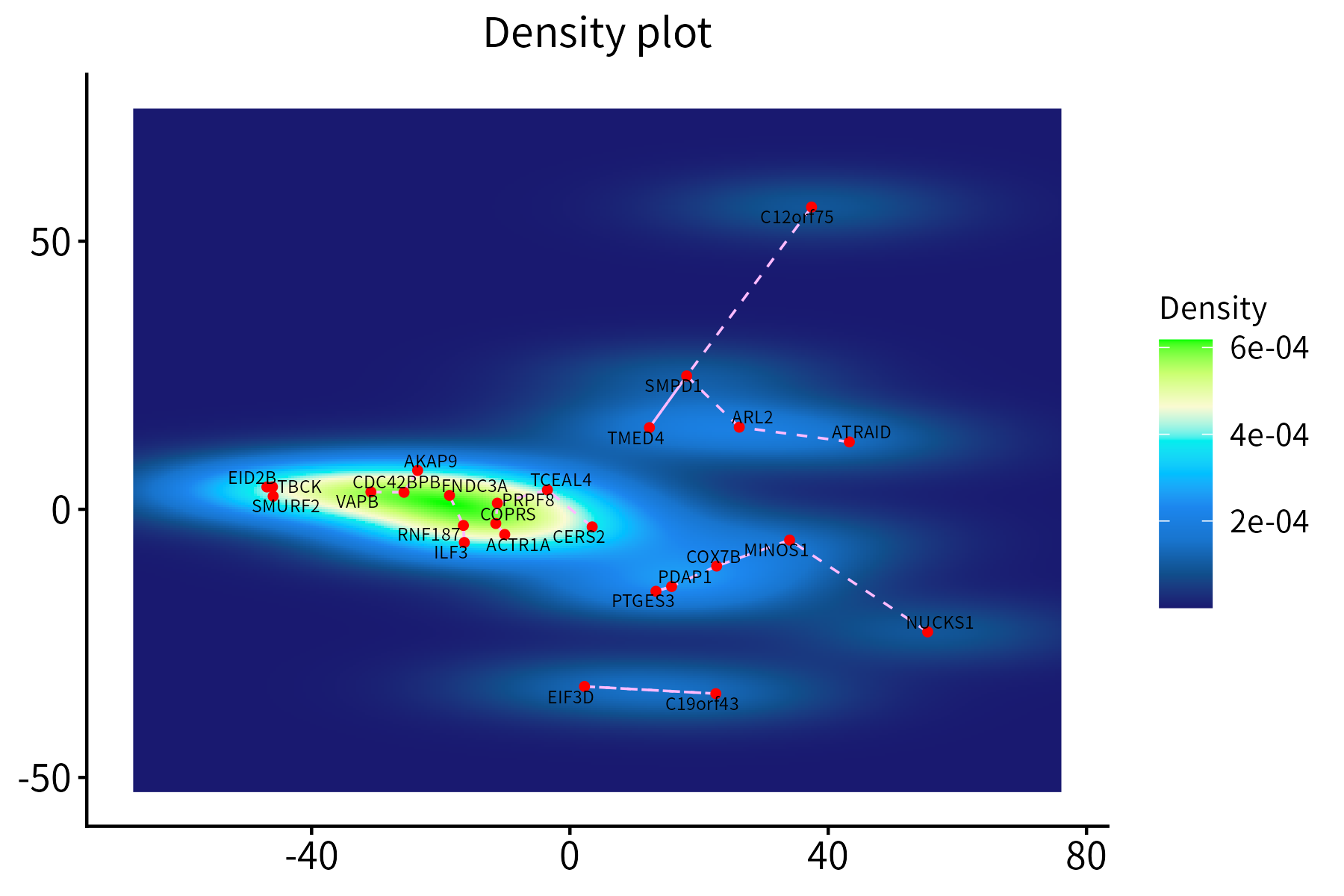 This function creates a density plot for a set of points, optionally displaying segements between each point and its nearest neighbor. It requires a data frame with the x and y coordinates of the points, which may additionally contain score and nearest-neighbor columns.