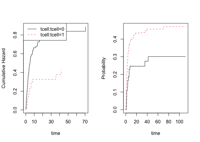 out1 <- resmeanATE(Event(time,cause)~tcell+platelet,data=bmt,cause=1,time=40,