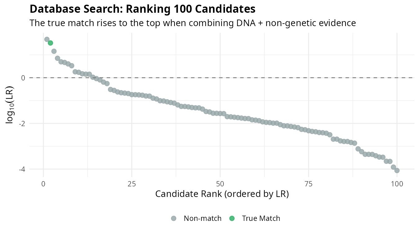 In practice, we search databases containing unidentified individuals. Each candidate receives an LR based on all available evidence, and candidates are ranked accordingly: