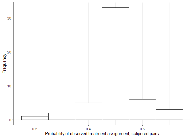 Matched pairs formed without using the dose assignment discrepancy caliper may have probabilities of observed treatment assignment heavily deviate from \(0.5\), as shown in the plot below.