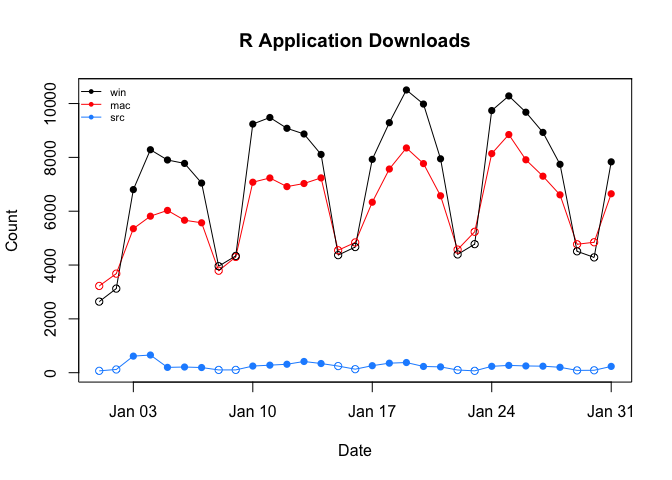 Typically, the pattern of R application downloads is a series of weekday peaks and weekends troughs. You can see this in the graph below, which plots the January 2022 data broken down by platform (Mac, Source, and Windows) and weekday/weekend (filled v. empty circles):