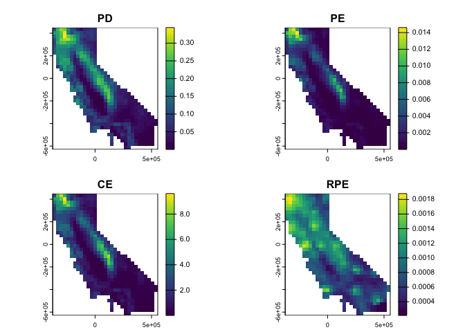 A key feature of phylospatial is full support for quantitative community data, including occurrence probabilities (e.g., from species distribution models) and abundances, in addition to binary presence-absence data. This avoids information loss from thresholding continuous data, and enables new analyses not available in other spatial phylogenetic R packages.