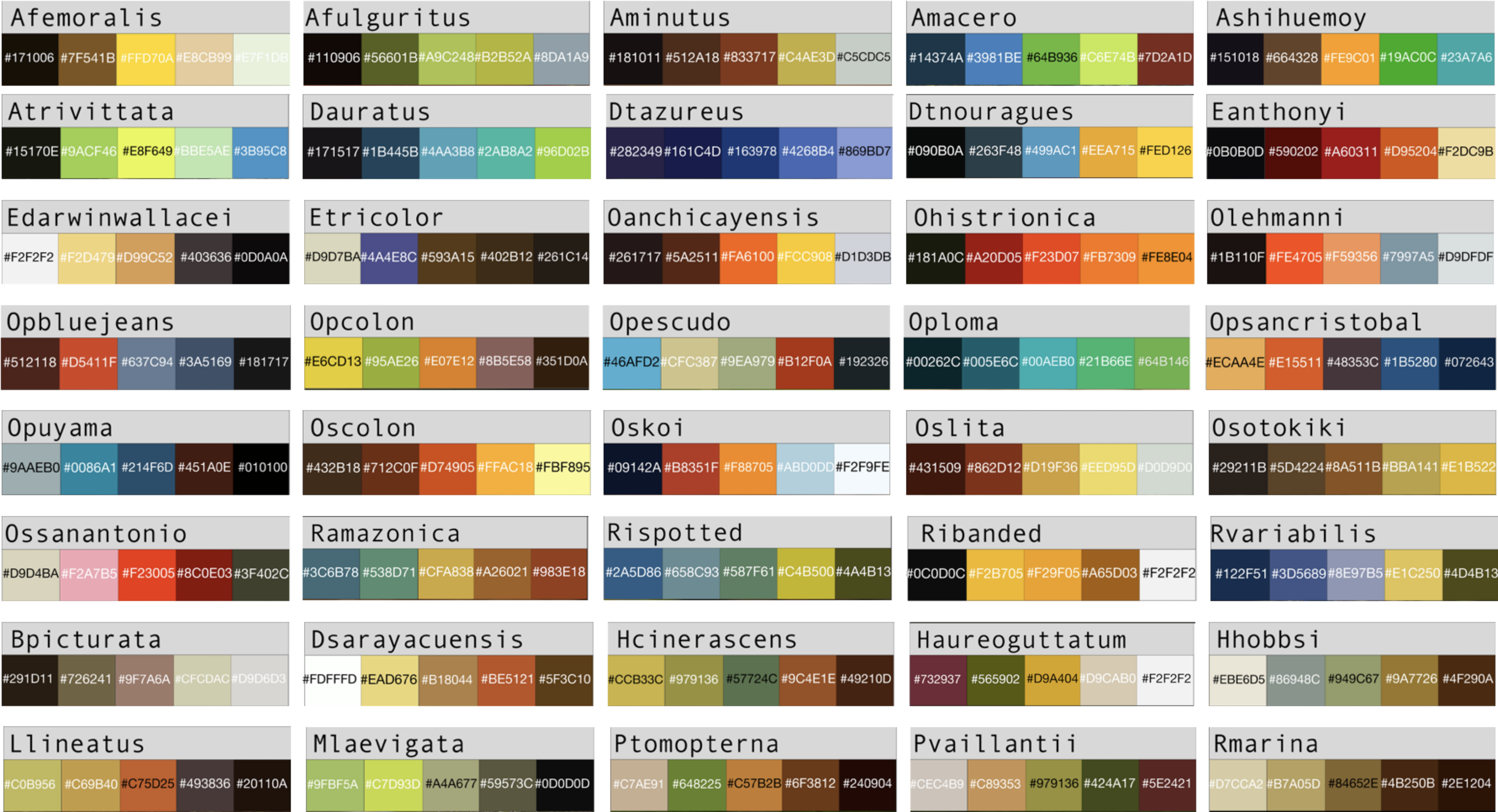 #> [37] "Ramazonica"      "Ribanded"        "Rispotted"       "Rmarina"
