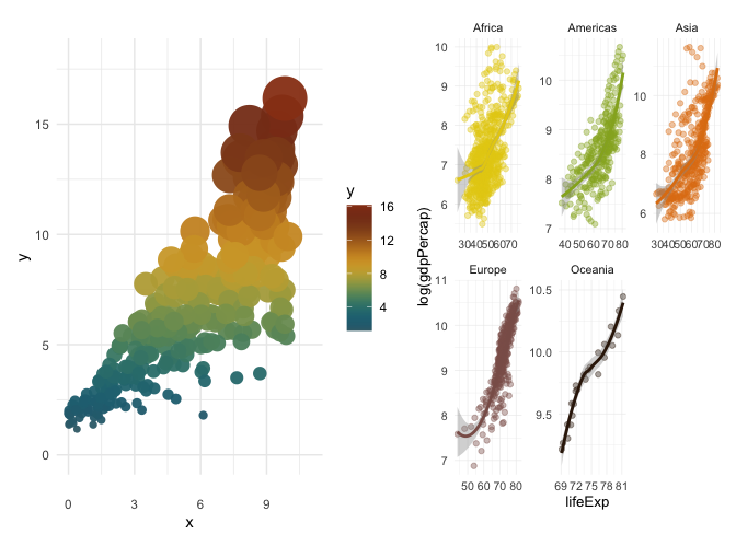 p4 <- ggplot(gapminder, aes(x = lifeExp, y = log(gdpPercap), colour = continent)) +