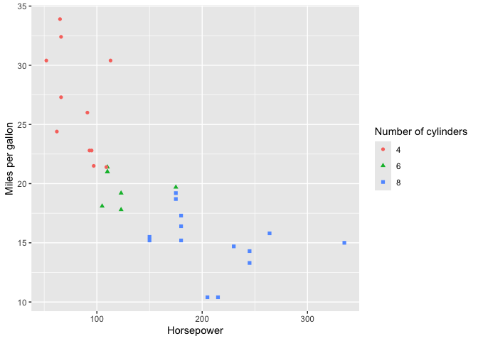 ggplot(aes(x=hp, y=mpg, color=cyl, shape=cyl)) +