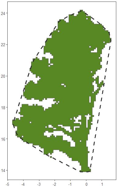 Illustration of convex hull (dashed line) and voxel hull (green feature) from example tree. The proportion of whitespace within the convex hull represents lacunarity (~20%)
