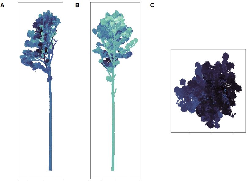 Creates a 3-panel plot showing two vertical profiles (X-Z and Y-Z) and an overhead (X-Y) view of the tree crown point cloud. Useful for spotting stray points or segmentation errors.
