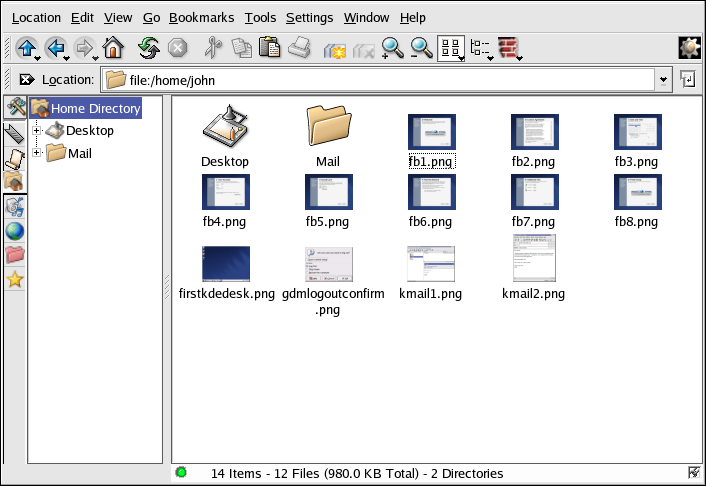 Konqueror opens up in a window on your desktop, allowing you to navigate through your home directory and throughout your Red Hat Enterprise Linux file system. After exploring, you can return to your home directory by clicking the Home button on the toolbar.
