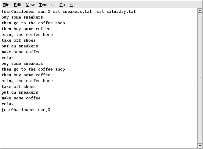 Next, use cat to join home.txt with sneakers.txt and redirect the output of both files to a brand new file called saturday.txt (as seen in Figure 3-7). Type the following: