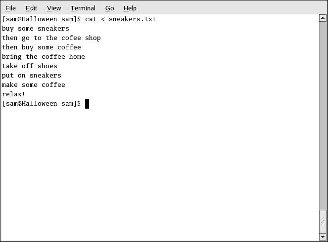 Do you notice anything different in Figure 3-6? There are no repeated entries. That is because the standard output from cat was redirected. That redirection was to a brand new file you made called sneakers.txt.