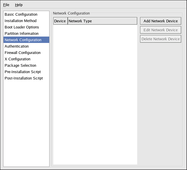 If the system to be installed via kickstart does not have an Ethernet card, do not configure one on the Network Configuration page.