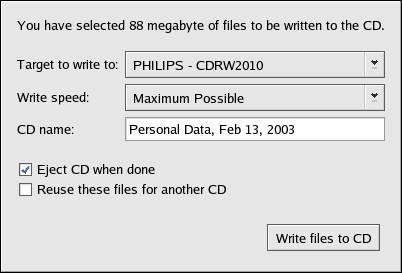 If you want to perform a quick file or directory backup to a CD-R or CD-RW, there is a tool included in the Nautilus file manager called CD Creator.
