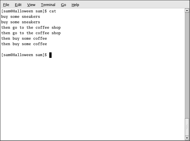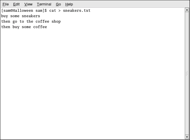 Do you notice anything different in Figure 3-6? There are no repeated entries. That is because the standard output from cat was redirected. That redirection was to a brand new file you made called sneakers.txt.