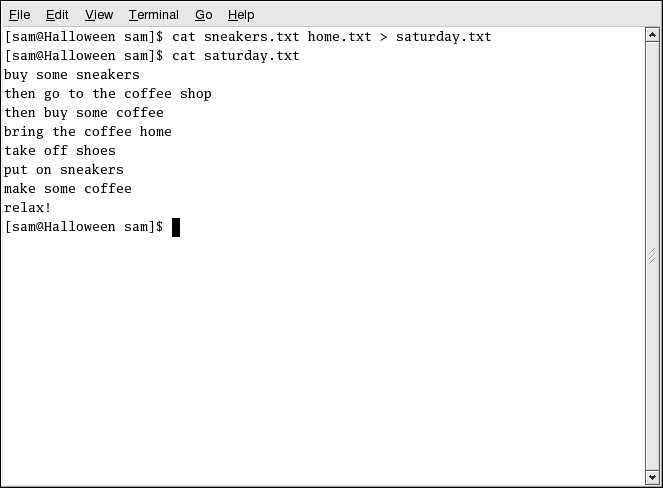 Next, use cat to join home.txt with sneakers.txt and redirect the output of both files to a brand new file called saturday.txt (as seen in Figure 3-7). Type the following: