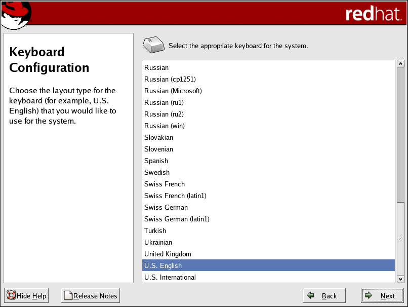 Using your mouse, select the correct layout type (for example, U.S. English) for the keyboard you would prefer to use for the installation and as the system default (refer to Figure 2-9).