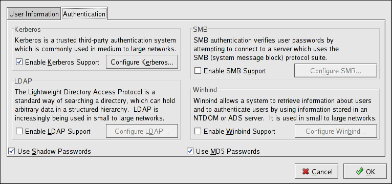 The krb5-libs and krb5-workstation packages must be installed for this option to work. Refer to the Red Hat Enterprise Linux Reference Guide for more information on Kerberos.